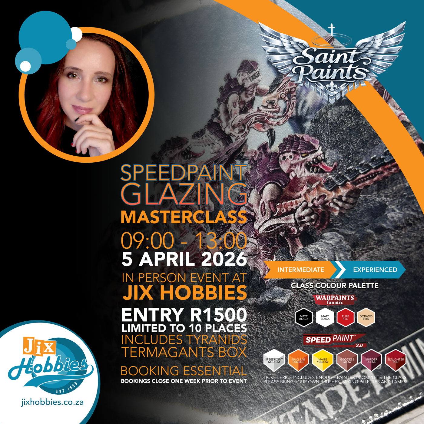 {"id":9231991767291,"title":"Games Workshop Figure Painting Class","handle":"games-workshop-figure-painting-class","description":"\u003cp\u003e\u003cstrong\u003eAwesome! You're about to book your place for the Speed Paint Glazing masterclass with Saint Paints which has been moved to the 5th of April 2026.\u003c\/strong\u003e\u003c\/p\u003e\n\u003cp\u003e\u003cstrong\u003eThis is an in-person event begin hosted at Jix Hobbies in Menlyn Retail Park.\u003c\/strong\u003e\u003c\/p\u003e\n\u003cp\u003e\u003cstrong\u003e\u003cspan style=\"color: rgb(255, 42, 0);\"\u003ePLEASE NOTE: THIS NOT A BEGINNER CLASS - This class is aimed at those of intermediate to experienced painting skill level.\u003c\/span\u003e\u003c\/strong\u003e\u003c\/p\u003e\n\u003cp\u003eYour ticket includes the 11 model Tyranids Termagants box which you will use for the class. It also includes enough paint to complete the class on the day.\u003c\/p\u003e\n\u003cp\u003e\u003cstrong\u003eBookings close one week prioir to the event. \u003c\/strong\u003eAll participants will be notified that bookings have closed and they will need to come to the store to collect their model kits as these will need to be built and primed for painting before the event.\u003c\/p\u003e\n\u003cp\u003ePlease bring your own brushes, mixing palettes and any lamps or lights you may need for the class. \u003c\/p\u003e","published_at":"2026-02-02T12:37:21+02:00","created_at":"2026-02-02T10:47:59+02:00","vendor":"Jix Hobbies","type":"Wargames \/ Miniatures Games","tags":["Army_Tyranids"],"price":150000,"price_min":150000,"price_max":150000,"available":true,"price_varies":false,"compare_at_price":null,"compare_at_price_min":0,"compare_at_price_max":0,"compare_at_price_varies":false,"variants":[{"id":47916232311035,"title":"Default Title","option1":"Default Title","option2":null,"option3":null,"sku":null,"requires_shipping":false,"taxable":true,"featured_image":null,"available":true,"name":"Games Workshop Figure Painting Class","public_title":null,"options":["Default Title"],"price":150000,"weight":0,"compare_at_price":null,"inventory_management":"shopify","barcode":"","requires_selling_plan":false,"selling_plan_allocations":[]}],"images":["\/\/jixhobbies.co.za\/cdn\/shop\/files\/Jix--SaintPaints--Workshop_20260219_ShopifyItem.png?v=1771500089"],"featured_image":"\/\/jixhobbies.co.za\/cdn\/shop\/files\/Jix--SaintPaints--Workshop_20260219_ShopifyItem.png?v=1771500089","options":["Title"],"media":[{"alt":null,"id":40675519496443,"position":1,"preview_image":{"aspect_ratio":1.0,"height":2250,"width":2250,"src":"\/\/jixhobbies.co.za\/cdn\/shop\/files\/Jix--SaintPaints--Workshop_20260219_ShopifyItem.png?v=1771500089"},"aspect_ratio":1.0,"height":2250,"media_type":"image","src":"\/\/jixhobbies.co.za\/cdn\/shop\/files\/Jix--SaintPaints--Workshop_20260219_ShopifyItem.png?v=1771500089","width":2250}],"requires_selling_plan":false,"selling_plan_groups":[],"content":"\u003cp\u003e\u003cstrong\u003eAwesome! You're about to book your place for the Speed Paint Glazing masterclass with Saint Paints which has been moved to the 5th of April 2026.\u003c\/strong\u003e\u003c\/p\u003e\n\u003cp\u003e\u003cstrong\u003eThis is an in-person event begin hosted at Jix Hobbies in Menlyn Retail Park.\u003c\/strong\u003e\u003c\/p\u003e\n\u003cp\u003e\u003cstrong\u003e\u003cspan style=\"color: rgb(255, 42, 0);\"\u003ePLEASE NOTE: THIS NOT A BEGINNER CLASS - This class is aimed at those of intermediate to experienced painting skill level.\u003c\/span\u003e\u003c\/strong\u003e\u003c\/p\u003e\n\u003cp\u003eYour ticket includes the 11 model Tyranids Termagants box which you will use for the class. It also includes enough paint to complete the class on the day.\u003c\/p\u003e\n\u003cp\u003e\u003cstrong\u003eBookings close one week prioir to the event. \u003c\/strong\u003eAll participants will be notified that bookings have closed and they will need to come to the store to collect their model kits as these will need to be built and primed for painting before the event.\u003c\/p\u003e\n\u003cp\u003ePlease bring your own brushes, mixing palettes and any lamps or lights you may need for the class. \u003c\/p\u003e"}