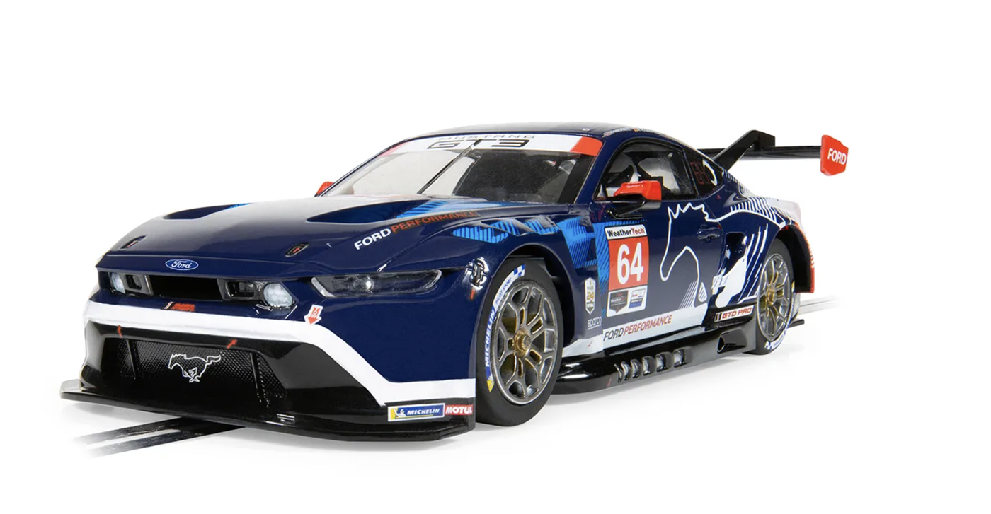 Experience the thunderous debut of the Ford Mustang GT3 in its striking blue and white Multimatic Motorsports livery from the 2024 24 Hours of Daytona. This Scalextric model captures the moment this iconic American muscle car evolved into a thoroughbred GT3 racer, turning heads with its aggressive stance and bold design. Piloted by endurance racing stars Christopher Mies, Mike Rockenfeller, and Harry Tincknell, this Mustang proved it had both bark and bite on one of motorsport's most gruelling stages.