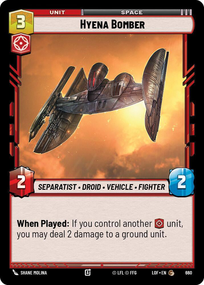 {"id":9139753582843,"title":"SWU - Hyena Bomber (660) (Foil)","handle":"lof-660-f","description":"\u003ch1\u003eHyena Bomber (Foil) Single Card \u003c\/h1\u003e\n\u003ch2 data-v-9476eeef=\"\"\u003eProduct Details\u003c\/h2\u003e\n\u003cdiv data-v-9476eeef=\"\" class=\"product__item-details__description\"\u003e\n\u003cstrong\u003eWhen Played:\u003c\/strong\u003e\u003cspan\u003e \u003c\/span\u003eIf you control another Aggression unit, you may deal 2 damage to a ground unit.\u003c\/div\u003e\n\u003cul data-v-9476eeef=\"\" class=\"product__item-details__attributes\"\u003e\n\u003cli data-v-9476eeef=\"\"\u003e\n\u003cdiv data-v-9476eeef=\"\"\u003e\n\u003cstrong data-v-9476eeef=\"\"\u003eRarity: \u003c\/strong\u003e\u003cspan data-v-9476eeef=\"\"\u003eCommon\u003c\/span\u003e\n\u003c\/div\u003e\n\u003c\/li\u003e\n\u003cli data-v-9476eeef=\"\"\u003e\n\u003cdiv data-v-9476eeef=\"\"\u003e\n\u003cstrong data-v-9476eeef=\"\"\u003eNumber: \u003c\/strong\u003e\u003cspan data-v-9476eeef=\"\"\u003e660\u003c\/span\u003e\n\u003c\/div\u003e\n\u003c\/li\u003e\n\u003cli data-v-9476eeef=\"\"\u003e\n\u003cdiv data-v-9476eeef=\"\"\u003e\n\u003cstrong data-v-9476eeef=\"\"\u003eAspect: \u003c\/strong\u003e\u003cspan data-v-9476eeef=\"\"\u003eAggression\u003c\/span\u003e\n\u003c\/div\u003e\n\u003c\/li\u003e\n\u003cli data-v-9476eeef=\"\"\u003e\n\u003cdiv data-v-9476eeef=\"\"\u003e\n\u003cstrong data-v-9476eeef=\"\"\u003eCard Type: \u003c\/strong\u003e\u003cspan data-v-9476eeef=\"\"\u003eUnit\u003c\/span\u003e\n\u003c\/div\u003e\n\u003c\/li\u003e\n\u003cli data-v-9476eeef=\"\"\u003e\n\u003cdiv data-v-9476eeef=\"\"\u003e\n\u003cstrong data-v-9476eeef=\"\"\u003eTraits: \u003c\/strong\u003e\u003cspan data-v-9476eeef=\"\"\u003eSeparatist; Droid; Vehicle; Fighter\u003c\/span\u003e\n\u003c\/div\u003e\n\u003c\/li\u003e\n\u003cli data-v-9476eeef=\"\"\u003e\n\u003cdiv data-v-9476eeef=\"\"\u003e\n\u003cstrong data-v-9476eeef=\"\"\u003eCost: \u003c\/strong\u003e\u003cspan data-v-9476eeef=\"\"\u003e3\u003c\/span\u003e\n\u003c\/div\u003e\n\u003c\/li\u003e\n\u003cli data-v-9476eeef=\"\"\u003e\n\u003cdiv data-v-9476eeef=\"\"\u003e\n\u003cstrong data-v-9476eeef=\"\"\u003ePower: \u003c\/strong\u003e\u003cspan data-v-9476eeef=\"\"\u003e2\u003c\/span\u003e\n\u003c\/div\u003e\n\u003c\/li\u003e\n\u003cli data-v-9476eeef=\"\"\u003e\n\u003cdiv data-v-9476eeef=\"\"\u003e\n\u003cstrong data-v-9476eeef=\"\"\u003eHP: \u003c\/strong\u003e\u003cspan data-v-9476eeef=\"\"\u003e2\u003c\/span\u003e\n\u003c\/div\u003e\n\u003c\/li\u003e\n\u003cli data-v-9476eeef=\"\"\u003e\n\u003cdiv data-v-9476eeef=\"\"\u003e\n\u003cstrong data-v-9476eeef=\"\"\u003eArena Type: \u003c\/strong\u003e\u003cspan data-v-9476eeef=\"\"\u003eSpace\u003c\/span\u003e\n\u003c\/div\u003e\n\u003c\/li\u003e\n\u003cli data-v-9476eeef=\"\"\u003e\n\u003cdiv data-v-9476eeef=\"\"\u003e\n\u003cstrong data-v-9476eeef=\"\"\u003eArtist: \u003c\/strong\u003eShane Molina\u003c\/div\u003e\n\u003c\/li\u003e\n\u003c\/ul\u003e","published_at":"2025-10-17T08:48:21+02:00","created_at":"2025-10-17T08:48:20+02:00","vendor":"Fantasy Flight Games","type":"Trading Card Games (TCG)","tags":["Aspect_Aggression","Brand_Fantasy Flight Games","Card Print_Foil","Card Type_Unit - Space","Category_Singles","Rarity_Common","Set_Legends of the Force","Type_Star Wars Unlimited"],"price":700,"price_min":700,"price_max":700,"available":true,"price_varies":false,"compare_at_price":null,"compare_at_price_min":0,"compare_at_price_max":0,"compare_at_price_varies":false,"variants":[{"id":47612344926459,"title":"Default Title","option1":"Default Title","option2":null,"option3":null,"sku":"LOF-660-F","requires_shipping":true,"taxable":true,"featured_image":null,"available":true,"name":"SWU - Hyena Bomber (660) (Foil)","public_title":null,"options":["Default Title"],"price":700,"weight":0,"compare_at_price":null,"inventory_management":"shopify","barcode":null,"requires_selling_plan":false,"selling_plan_allocations":[]}],"images":["\/\/jixhobbies.co.za\/cdn\/shop\/files\/SWU---Hyena-Bomber---660---Foil.jpg?v=1760683703"],"featured_image":"\/\/jixhobbies.co.za\/cdn\/shop\/files\/SWU---Hyena-Bomber---660---Foil.jpg?v=1760683703","options":["Title"],"media":[{"alt":null,"id":39945133818107,"position":1,"preview_image":{"aspect_ratio":0.716,"height":1000,"width":716,"src":"\/\/jixhobbies.co.za\/cdn\/shop\/files\/SWU---Hyena-Bomber---660---Foil.jpg?v=1760683703"},"aspect_ratio":0.716,"height":1000,"media_type":"image","src":"\/\/jixhobbies.co.za\/cdn\/shop\/files\/SWU---Hyena-Bomber---660---Foil.jpg?v=1760683703","width":716}],"requires_selling_plan":false,"selling_plan_groups":[],"content":"\u003ch1\u003eHyena Bomber (Foil) Single Card \u003c\/h1\u003e\n\u003ch2 data-v-9476eeef=\"\"\u003eProduct Details\u003c\/h2\u003e\n\u003cdiv data-v-9476eeef=\"\" class=\"product__item-details__description\"\u003e\n\u003cstrong\u003eWhen Played:\u003c\/strong\u003e\u003cspan\u003e \u003c\/span\u003eIf you control another Aggression unit, you may deal 2 damage to a ground unit.\u003c\/div\u003e\n\u003cul data-v-9476eeef=\"\" class=\"product__item-details__attributes\"\u003e\n\u003cli data-v-9476eeef=\"\"\u003e\n\u003cdiv data-v-9476eeef=\"\"\u003e\n\u003cstrong data-v-9476eeef=\"\"\u003eRarity: \u003c\/strong\u003e\u003cspan data-v-9476eeef=\"\"\u003eCommon\u003c\/span\u003e\n\u003c\/div\u003e\n\u003c\/li\u003e\n\u003cli data-v-9476eeef=\"\"\u003e\n\u003cdiv data-v-9476eeef=\"\"\u003e\n\u003cstrong data-v-9476eeef=\"\"\u003eNumber: \u003c\/strong\u003e\u003cspan data-v-9476eeef=\"\"\u003e660\u003c\/span\u003e\n\u003c\/div\u003e\n\u003c\/li\u003e\n\u003cli data-v-9476eeef=\"\"\u003e\n\u003cdiv data-v-9476eeef=\"\"\u003e\n\u003cstrong data-v-9476eeef=\"\"\u003eAspect: \u003c\/strong\u003e\u003cspan data-v-9476eeef=\"\"\u003eAggression\u003c\/span\u003e\n\u003c\/div\u003e\n\u003c\/li\u003e\n\u003cli data-v-9476eeef=\"\"\u003e\n\u003cdiv data-v-9476eeef=\"\"\u003e\n\u003cstrong data-v-9476eeef=\"\"\u003eCard Type: \u003c\/strong\u003e\u003cspan